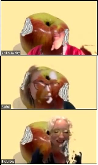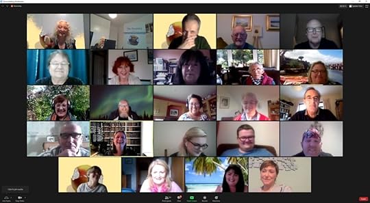 I sent an email to everyone with the jpeg of the book cover attached and instructions to download it to their device for use as the background. The plan being we’d have all these lovely rectangles with a picture of the book behind us and an array of happy faces with raised glasses.