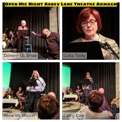 Last Friday night, I was proud to be included in a contingent from Women Aloud NI who were invited as special guests to the always wonderful Open Mic Night in the Abbey Lane Theatre. I'm a huge fan of this establishment and always have a grand old evening there but it was with a double pride that I presented it to my sistas from Women Aloud NI and vice versa. Each group wowed the other and rightly so. The readings were deep, rich, lewd and entertaining in equal measure and doubled down by the musical acts and poetry from regulars, it added up to a brilliant night. It filled me up with that "ah, my wee Armagh" glow that warms my heart so often these days.