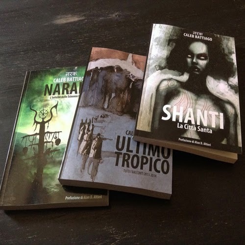 Dopo le edizioni cartacee dei romanzi Naraka e Shanti , da oggi è disponibile un nuovo titolo, sempre su carta, Ultimo Tropico - Tutti i Racconti 2013-2014 . Il libro contiene: "Limbus - Trilogia di Scarafaggi", "Miclan - Doppio Inferno", "Vessel - Orrore in Terrasanta", "I Giorni della Gallina Nera", "Kiki. Sangue a Berlino-Brandeburgo", "Regnum Congo", "Malanima - Storie di Lame e Presenze", "Parigi Sud 5 - Il Quartiere dell'Apocalisse", "Acrux Reloaded" e "Ancora Arancione". 350 pagine di racconti, una edizione speciale che non è disponibile anche in formato ebook. Ecco l'immagine della retro:
