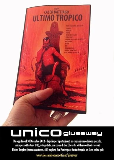 Per ringraziare amici e lettori per avermi seguito quest'anno, da oggi, fino al 30 dicembre 2014, è aperto un particolare Giveaway natalizio, chiamato non a caso "Unico" che mette in palio una una edizione cartacea speciale (unica copia, fuori commercio), autografata, di "Ultimo Tropico - Tutti i Racconti 2013/2014", 400 pagine con copertina lucida flessibile, con l'illustrazione di copertina del grande Les Edwards, guru dell'artwork internazionale di genere. La sua "diabolica" illustrazione, che potete vedere meglio alla fine del post, è un'opera realizzata con tecnica ad olio. Questo libro, con copertina speciale, dunque diversa dalla edizione standard in commercio, è stato realizzato ad hoc per il Giveaway, ne esiste solo una copia. Il vincitore sarà estratto il 31 dicembre (tramite il generatore online di numeri randomici www.random.org) tra tutti partecipanti del Giveway. Il vincitore sarà avvisato via email entro il 3 gennaio 2015 e dovrà fornire il proprio indirizzo per la spedizione del premio. Ultimo Tropico contiene tutti i racconti pubblicati (generi: fantascienza distopica e apocalittica, horror, hard thriller, epic horror, weird, dark eros) nel biennio 2013/2014: ecco i titoli delle opere contenute nel libro, tra singoli racconti e raccolte: "Limbus - Trilogia di Scarafaggi", "Mictlan - Doppio Inferno", "Vessel - Orrore in Terrasanta", "I Giorni della Gallina Nera - L'Apocalisse a Roma", "Kiki - Sangue a Berlino-Brandeburgo", "Regnum Congo", "Malanima - Storie di Lame e Presenze", "Parigi Sud 5 - Il Quartiere dell'Apocalisse", "Acrux Reloaded", "Ancora Arancione", "Weird West Blues - Storie di Zolfo e di Frontiera"