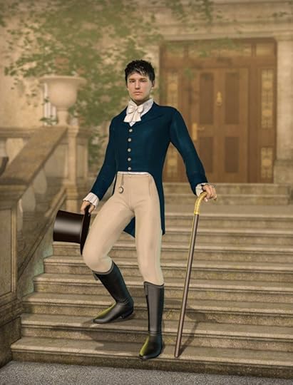 Elegant young gentleman dandy dressed in Regency fashion holding a hat and walking cane on the footsteps to a impressive mansion, 3d render.