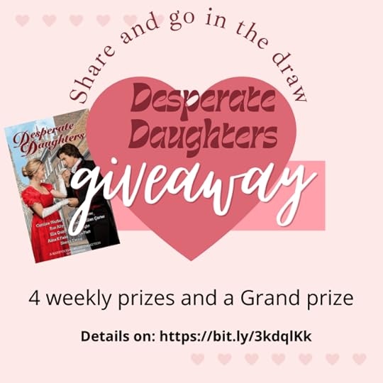a reticule from Regency Style by Susana https://www.etsy.com/shop/RegencyStylebySusana?section_id=37612635winner’s choice of one ebook copy of a previous Bluestocking Belles collection https://bluestockingbelles.net/belles-joint-projects/winner’s choice of one ebook copy from the backlists of Desperate Daughters authors: Rue Allyn, Elizabeth Ellen Carter, Sherry Ewing, Alina K. Field, Jude Knight, Mary Lancaster, Meara Platt, Ella Quinn, and Caroline Warfield.We’ll draw a winner each week for four weeks.