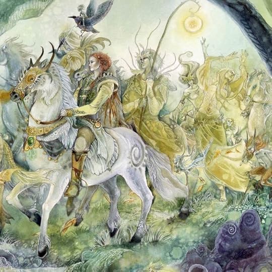 They were beautiful, all make that clear, and the man (or angel or devil or elf-king) at their head was the loveliest of all. Dressed in white, crowned in gold, with long flowing locks. Jewels glittering from rings and brooches and even the cuffs of his boots. A long cloak (or perhaps wings) streaming behind him.