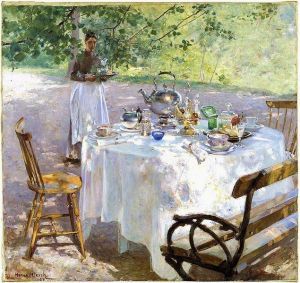 Margaret emerged from the shop with their tea on a tray: a teapot under a knitted cosy, two cups on saucers, a small jug of milk, and a bowl of sugar.