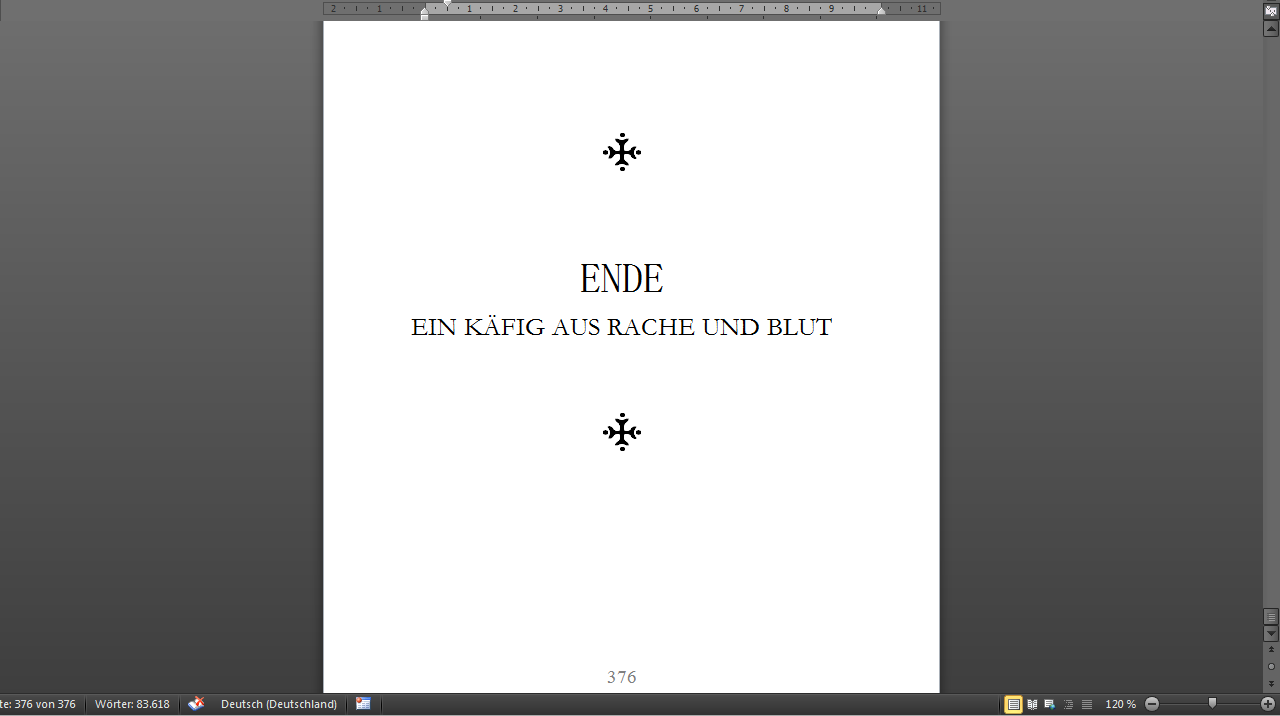 Wie einige von euch vielleicht schon mitbekommen haben, habe ich vorgestern den Roman "Ein Käfig aus Rache und Blut" beendet. Am Ende sind es jetzt 85.000 Wörter, etwas weniger, als erwartet, aber da in der Überarbeitung noch einiges dazu kommt, vielleicht gerechtfertigt. Das Produkt lasse ich jetzt etwas ruhen. Ich habe nicht mehr als anderthalb Monate für's reine Schreiben gebraucht und das ist für mich wirklich rekordverdächtig. xD Kann es noch immer kaum glauben.