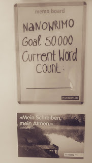 Das Projekt muss natürlich genauso wie alle anderen von A bis Z durchgeplant werden, insbesondere da die Welt sich in einem teilweise postapokalyptischen Zustand befindet. Alles sehr komplex und kompliziert - insbesondere die Charaktere sind anstrengend zu konzipieren, weil sie viel mehr Ziele und Motivationen besitzen und ich schreibe hier nicht mehr länger aus der Ich-Perspektive, sondern versuche mich das erste Mal überhaupt an der dritten Person. (Wünscht mir Glück!) Gestern habe ich dann endlich mit der eigentlichen Plotstruktur angefangen, da das World Building soweit abgeschlossen ist. Natürlich muss ich mich auch irgendwie motivieren und dazu ist mein kleines, aber sehr nützliches Memo Board da, auf dem ich mein Wunschziel von 50.000 Wörtern markiert habe. Dort aktualisiere ich jeden Abend (Morgen) meinen neuen Word Count, um auch zu verbildlichen, dass ich etwas geschafft habe.