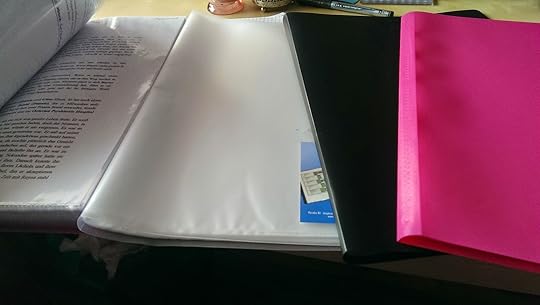 Die schwarze Mappe benötige ich nun für die Kapitel, die ich gerade überarbeitet habe. Seit Arsida drucke ich zum Korrigieren die einzelnen Kapitel aus, weil ich dadurch vielmehr Fehler sehe, als wenn ich das am Laptop oder am eReader mache. Recht seht ihr, dass sie ganz schön dick geworden ist. Damit ich nicht zu viel Papier verschwende, werde ich sie rückseitig nochmal bedrucken, wenn die erste Überarbeitung geschafft ist. Ich bin zum einen nicht Krösus und zum anderen müssen wir alle auf die Umwelt achten. Die anderen beiden Mappen verwende ich für die Planung von Die Unwandelbaren Teil IV, der noch immer keinen Titel trägt. Mal sehen, mir fällt bestimmt ein, was ich da noch alles schön einsortieren kann xD Ordnung motiviert mich eben einfach. :D