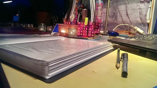 Hier seht ihr ein Bild, wie es von innen aussieht. Meine Anmerkungen sind in schwarz, wahrscheinlich wäre rot besser, aber ich liebe meine schwarzen Liquid Longline von Aldi *hust* Jedenfalls befinde ich mich gerade bei Kapitel 20 und es fehlen nur noch ... äh, acht, glaube ich :) Danach liest noch einmal meine Betaleserin drüber und ich auch und dann ... joar, sollte es eigentlich fertig sein. Freu mich schon sehr, wenn ich Arsida endlich veröffentlichen kann. Von wegen Mai xD LAURA.