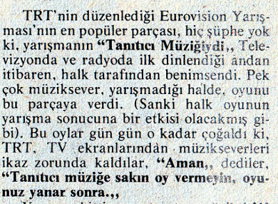 Neyse ki TRT, katılmıyor olsak bile bizi yarışmadan mahrum etmeyecek ve hem radyo hem de televizyondan naklen yayınlayarak bize bir yandan iyilik, bir yandan da kötülük yapacaktı. İyilikti, çünkü olur da bir gün katılmaya karar verirsek, artık ne yapmamız gerektiği konusunda eskisinden daha fazla şey biliyor olacaktık. Kötülüktü, çünkü ekran başında bütün ülkeler arz-ı endam ederken, biz öyle bakakalacak, yutkunmaktan bir hal olacaktık.