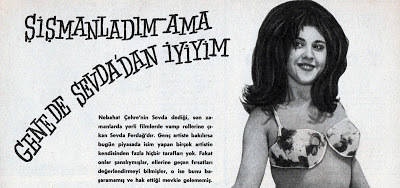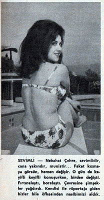 Sanırsınız yukarıda anlatılanlar 2008-2010 yılları arasında yaşanıyor da yüzüğü gösteren Nebahat Çehre değil; bizzat Firdevs Yöreoğlu. Öyle de Firdevs’lik bir hareket aslında ama Ses dergisi muhabirinin saniyesi saniye okuyucuya aktardığı bu anlar, 1964 yılında Nebahat Çehre’yle havuz başında yapılan bir röportajda yaşanıyor. Olay havuz başında cereyan ettiği içinde genç Nebahat haliyle mayosuyla poz veriyor derginin fotoğrafçısına, o sıralar kilo aldığından yakınmayı da ihmal etmeden.