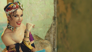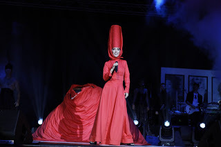 Kafası bildiğin türbanlı ama hani türbanın içine sünger koyuyorlar ya böyle dik duruyor, onun beş misli filan abartılmışı. Elbise de boğazına kadar kapalı. Eteklerse yerden üç metre yukarıda… İçi belli ki tarlatanlı (bir müzik yazısı içerisinde bu kelimeyi, hem de iki kere kullanan tek kişi olarak tarihe geçmiş olabilirim şu an); yani böyle belden ayaklara doğru açılarak genişliyor. (Hadi meraklısına teknik bilgi de vereyim; etek 4 metre çapında imiş ve 50 metre kumaş kullanılarak yapılmış.)