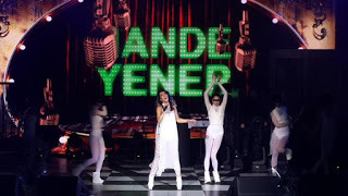 Sonra gene bir durduk, Hande bir kulise gitti geldi ve sağ omzundan pörtlemiş kocaman bir gülle aynı renk etekliği ile karşımıza çıktı ve “Bana Anlat”ı söyledi.