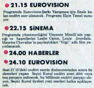 Finalist şarkıların sırasıyla ekrana getirilmesinden sonra, o günlerde her cuma akşamı olduğu gibi yine Televizyonda Sinema kuşağı yayına girdi. O gecenin filmi 1958 yapımı, 9 Oscar ödülü sahibi “Gigi” adlı müzikaldi.