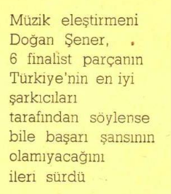 Müzik yazarı Doğan Şener de, Cumhuriyet gazetesinden Hıncal Uluç’a konuyla ilgili verdiği röportajda finale kalan parçalar hakkında iyimser yorum yapamıyor, Uluç’un “Bu finalist 6 parça halk oylamasına kadar geçecek süre içinde ne türlü bir gelişme gösterebilir, bulundukları noktadan ileriye ne kadar gidebilir?” sorusunda şöyle cevap veriyordu:
