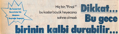 Film ve peşi sıra gelen gece haberleri nihayet bittiğinde ise heyecan doruktaydı. Finale kalan şarkıların açıklanması için çok enteresan bir yöntem izlenecek ve bütün şarkılar baştan sonra yeniden yayınlanırken finale kalanlar için şarkının yayını esnasında ekranda “Final Final Final” yazısı belirecekti. Jürinin seçtiği şarkıların anons edilmesi ve arka arkaya yayınlanması daha kısa ve kolay bir yöntemken TRT yetkilileri bu heyecansız yarı finale biraz heyecan getirmek için olsa gerek, böyle bir yolu tercih etmişlerdi. 14 şarkı sırayla bir kez daha ekrana geldi ve sadece 6 şarkıda ekranda “Final Final Final” yazısı belirdi.