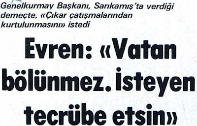 2 Mart 1979 günü Genelkurmay Başkanı Orgeneral Kenan Evren, Kars Sarıkamış Orduevi'nde yaptığı konuşmada Silahlı Kuvvetler’in vatanın bölünmesini isteyen iç ve dış düşmanları bulunduğunu söyleyerek, “Biz el ele, gönül gönüle olduğumuz sürece bu vatan bölünmez, isteyen tecrübe etsin. Ben dâhil, bizim cesetlerimizin üzerinden geçmeden bu vatanı kimse bölemez.” diyecekti.