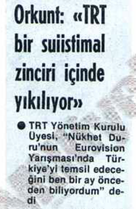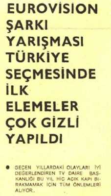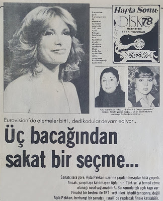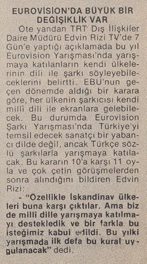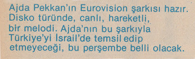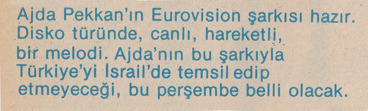 Derginin haberine göre Ajda Pekkan 6 Aralık’ta Türkiye’ye gelecek, hemen ertesi gün ise Ankara’ya uçacak, TRT yetkilileri ile yüz yüze görüşecekti. Düğüm o zaman çözülecek, şayet Ajda ile anlaşma sağlanırsa, belki de şartname yayımlanmış olmasına rağmen elemeler iptal edilecekti.