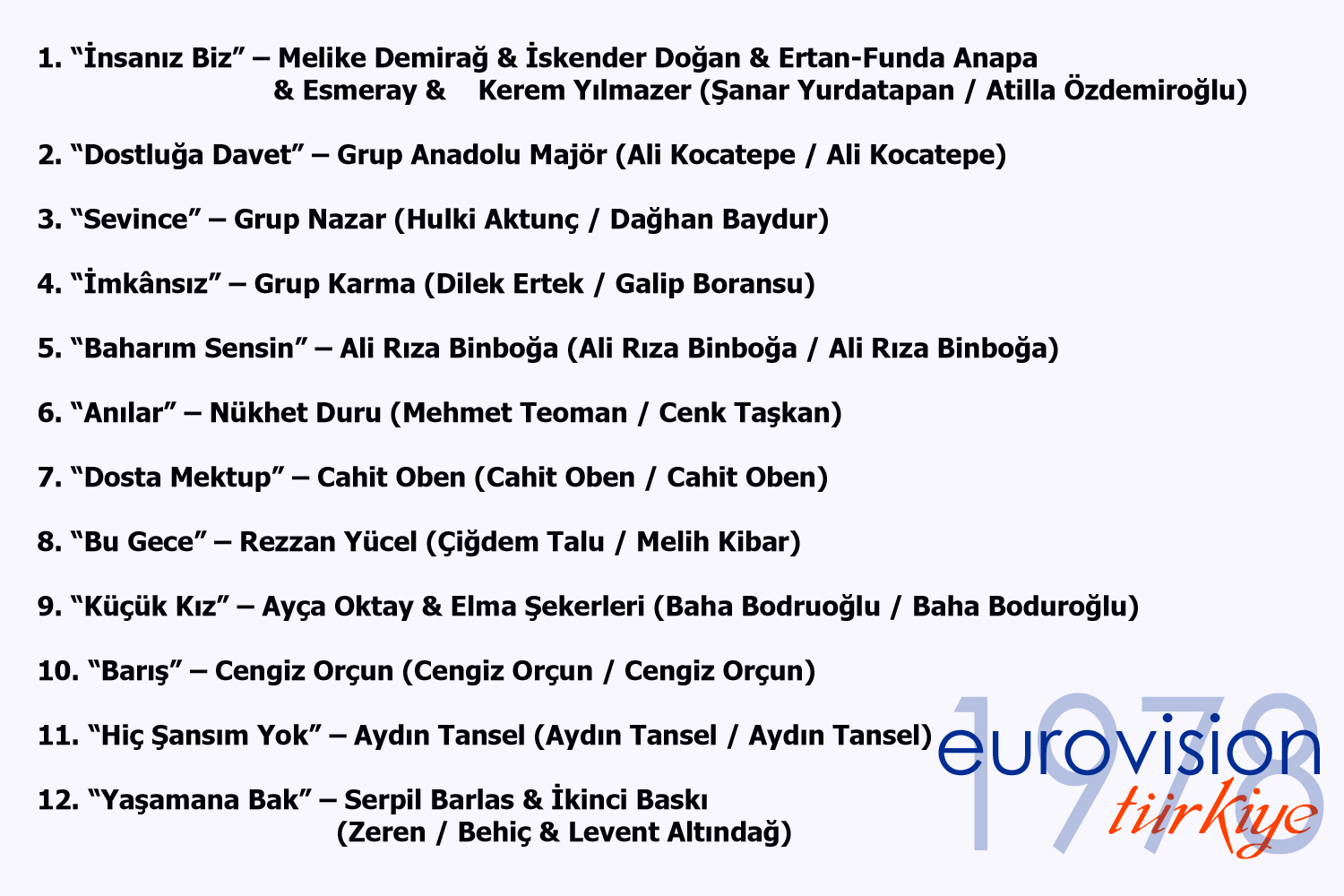 Semiha Yankı’nın Türkiye’yi tek başına temsil ettiği 1975 yılındaki yarışmayı Hollandalı bir grubun kazanması, aynı şekilde 1977’de de Brotherhood Of Man grubunun birinciliği ve yarışmanın genelinde görülen grup hakimiyeti jüriyi de etkilemiş olacaktı ki 1978 Türkiye finaline seçilen şarkıların büyük kısmı gruplar tarafından seslendiriliyordu.