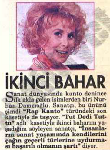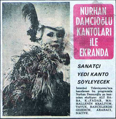O Nurhan Damcıoğlu ki Türkiye’de kanto denilince ilk akla gelen isimdir. Amelyaları, Peruzları, Şamran Hanımları kimse anımsamaz çünkü onlar Direklerarası’nda, Şehzabaşı’nda, 19. yüzyılın ikinci yarısının İstanbul’unda kalmıştır. Onların o vakitler söylediği kantoları uzun yıllar sonra araştırıp bulan, yeniden söyleyip gündeme getiren ve bugünlere ulaşmasını sağlayansa Nurhan Damcıoğlu’dur.