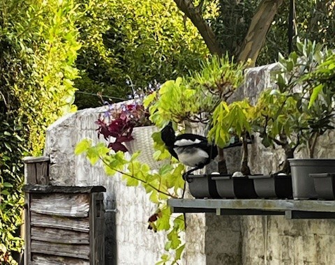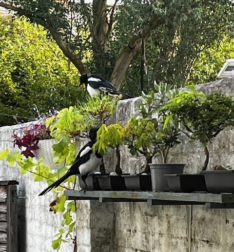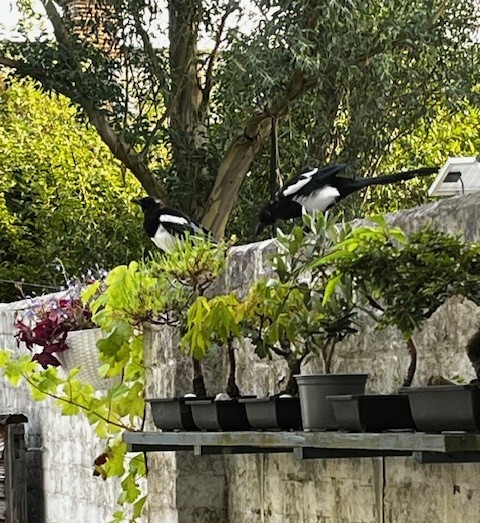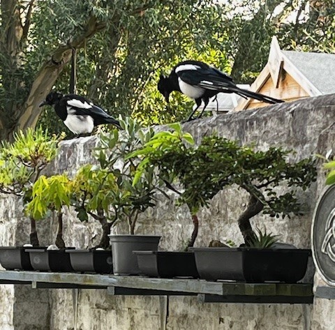 I peeked out of the window, wondering what was going on. Two young magpies were visiting my bonsai and looked utterly ridiculous. Birds in proper trees look normal, but these two looked like giants against my small trees!