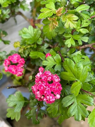 ‘The hawthorn has flowers!’ she pronounced. I struggled to the window, hoping to see for myself. And there it was, a touch of pink on the very last tree on the shelf. Number one son did no more, he went out there and photographed it, so I could have a good look.