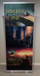 As the title indicates, I’ve got some new signs made for LJR Publishing and will be displaying those first at the upcoming SupaNova Comic & Gaming Con in Sydney this weekend, starting Friday (Jun 21st). I created Book Posters, which are large A2 sized posters of the book covers for my Gorp the Goblin trilogy. I plan to hang these up around my booth or in front of the table, so large crowds of people can see what it is I’m about without having to come near my table to see the books themselves. Below, I’ve also made an Exhibition Banner from the amazing artwork of Simon Tjong of the full book covers of all 3 books.