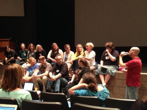 I wasn’t scheduled until session 2, so I grabbed a quick bite to eat in the teacher’s lounge and hung out with Donalyn Miller’s awesome family. And then I led the “Picture Book Panel” featuring NINE Picture Book Pros: Miriam Busch (Lion, Lion), Larry Day (Nanook & Pryce), Matthew Cordell, Philip C. Stead, Erin Stead, Debbie Ridpath Ohi, Lauren Castillo, Deb Pilutti (Ten Rules of Being a Superhero), and Matt Faulkner (A Taste of Colored Water).