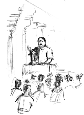 அப்போது எனக்கு வயது பதினொன்று. தொண்ணூற்றொராம் ஆண்டு யாழ்ப்பாணக் கம்பன் விழா. நல்லை ஆதீனத்தில், இட நெருக்கடியால் வெளியிலே நெரிசலில் நின்று எட்டி எட்டிப் பார்த்தபோது வெறுமனே உயரமான நடுவர் இருக்கையில் இருந்தவர் மாத்திரமே தெரிந்தார். மேடை தெரியவில்லை. அப்பாவை இம்சித்து என்னைத் தோளில் தூக்கி வைத்துக் காட்டச்சொல்லிப் பார்த்த பட்டிமண்டபம் அது.