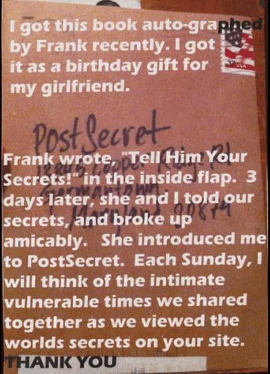 My boyfriend knew I was a PostSecret fan and a couple of days before Christmas this was in a package on my porch. It was the most thoughtful and unexpected gift. Thanks Rod and Frank!