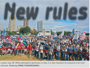 On the other hand, people did not go in big numbers to the EDSA shrine rally last Sept. 11 partly because they did not want to burden fellow citizens by contributing adversely to traffic in EDSA. People want to express themselves but do not want to inflict suffering on others while doing so. It also seems to suggest that people want things done more orderly and with predictability.