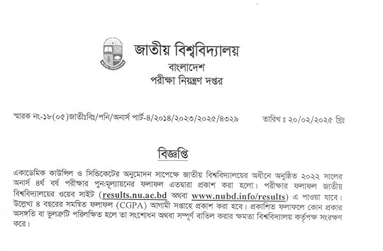Honours 1st Year Result 2025The results of the Honours 1st Year Examination 2023, held under the National University of Bangladesh, will be published today, March 24, 2025, at 7:00 PM, subject to the approval of the Academic Council and Syndicate.
