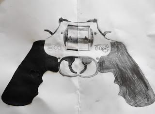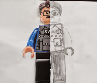We began with the classic symmetry art project, and my boys totally blew me away with their attention to detail! I had them cut out a photo from a magazine and then cut it in half. They glued half of the photo on a sheet of paper and drew the rest. I had to remind them to create a mirror image so it is symmetrical (like a butterfly) since kids naturally want to finish the picture. Can you tell both were created by boys- Legos and guns? Boys will be boys. I'm sure my girl would have chosen a flower or a cute animal. ☺