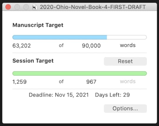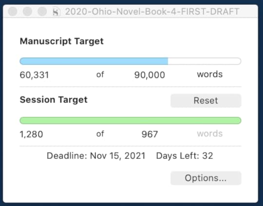 1280 words for the day (of 1250 planned), 60,331 total on the novel, and today was a magnificent writing day.