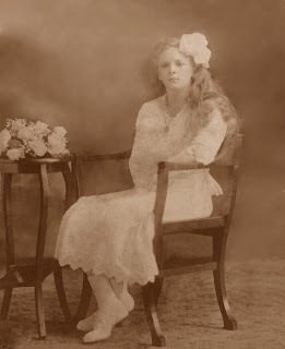 Pretty as a picture in a frame, the young woman looks from the window of a Queen Anne style home. Luxurious golden locks flow to her ivory shoulders. She smoothes the ruffles on her Victorian dress, then folds her hands demurely on her lap.