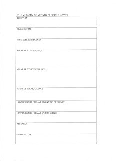 If you can't read the image, my boxes have the following prompts: * Location* Season/time (so I don't have to stop and wonder what the light is like etc)* Who else is in the scene?* What are they doing? * What are they wearing? * Point of scene/Change (vital: every scene has to change something, and it's easy to get carried away writing a lovely scene where your characters just continue being themselves and nothing really happens)* How does she feel at beginning of scene?* How does she feel at the end? (change again)* Research (exactly what I need to find out about)* Other notes (because I'm bound to have forgotten something important)