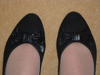 It is too warm for winter boots, but my toe nails are unpolished at the moment (a job for this afternoon) so I wore my favourite black pumps, forgetting that they are so old and sloppy now they are impossible to walk in, in spite of heel grips, sole inserts and so on. This obviously meant that I had to stop on the way back to buy new shoes. There is a limit to how exciting black pumps can be, but I think these are rather sweet with their discreet bow, and, even better, they sure are comfy.