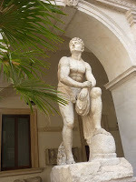 Jenny telling me about an academic article on classical scrotums. Apparently, it was believed that the left testicle was the source of daughters, the right provided sons, so to indicate virility, classical statues often show the right testicle as bigger. This meant that we spent a lot of time staring at the genitals on the (wonderful) statues in the Palazzo, puzzled by the fact that there it was the lefttesticle that seemed to be bigger on most statues. It might have looked as if two middle-aged women had an unhealthy interest in male genitalia, but we were motivated purely by scholarly research, honest.