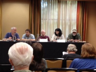 That's Joe Lansdale, Howard Waldrop, William Browning Spencer, Me, and Neal Barrett, Jr. It was on SF/F in Texas, but after getting interrupted by a fire alarm twice, having to go out the emergency door and stand in the grass, then coming back in and being interrupted by the announcement that the emergency was over, it was mostly talking about everyone's first experiences with fandom and other stories. It was a really funny panel and the audience (and me) were laughing most of the time, including when we had to go stand outside.