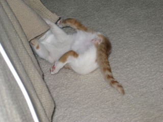 He hasn't broken anything yet. (Tasha was the kitten of breaking stuff, and racked up more points on that score than all the other cats we've ever had combined.) He does get into everything. At one point he saw me pull over a stool so I could get to the top shelf of the living room bookcase. He had ignored it up until then, but after that he started trying to climb it.