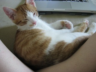 Jack the kitten is doing fine, except for waking up at 5:00 am and purring and trying to lick my face. And trying to eat everything in sight. You can really tell he was feral before the shelter got him.