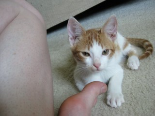 The kitten was picked up as a stray and not well socialized, but very much inclined to be socialized. Through the morning and early afternoon there was a lot of scampering away and playing, and then after some food and the second nap he discovered that being petted by your own personal human is a very good thing. Since then there's been lots of cuddling and purring.