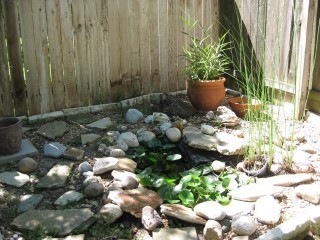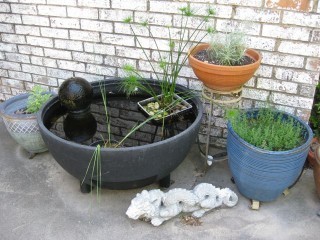 The water feature with dwarf papyrus and baby bull rushes, and herbs sage, curry, and thyme.