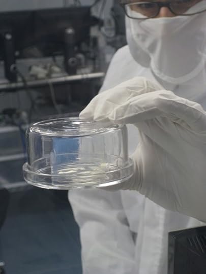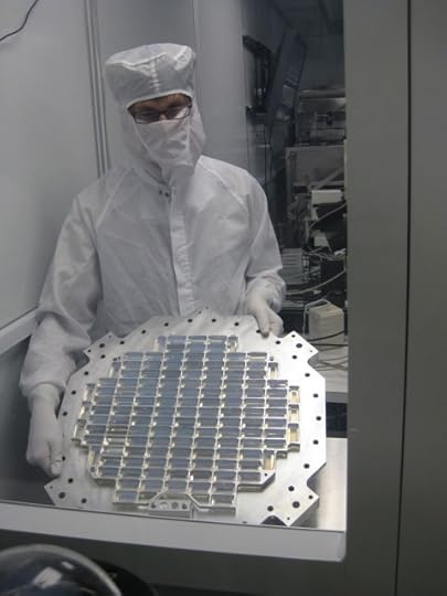This is one of the plates filled with aerogel medium where the stardust particles were captured. (We're looking at it through a glass partition into the lab.)