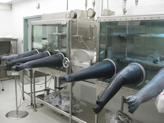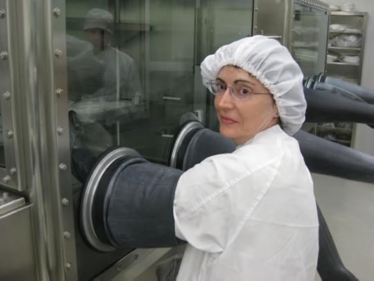 Me demonstrating putting your hands into the gloves to work inside the cabinets. Ignore my expression, I'm terrible at having my picture taken.