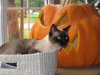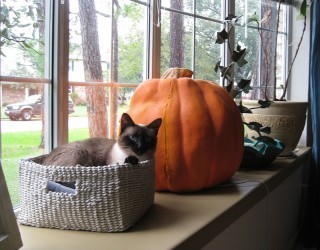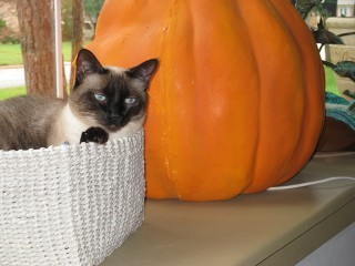 I put the first of the Halloween pumpkins out today. The big one goes in the bay window for now (we don't do most of the big outdoor decorations until closer to Halloween) and I was a little worried Tasha might be afraid of the giant orange thing next to her favorite basket. But not so much.