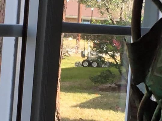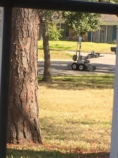 They tried to get someone in the house to answer them, but there wasn't a peep. I think by that point they were figuring that nobody was inside. They brought a robot out (someone pointed out from he photo that it was a bomb-finding robot but it's a small town and there's only one robot) and used it to search the house, then the SWAT guys finally went in. No one was inside, which was a relief. Then our SWAT guy and all the others left, then the regular cops came back but eventually left. They told us they had finally located the neighbor and he was out of town for the weekend.