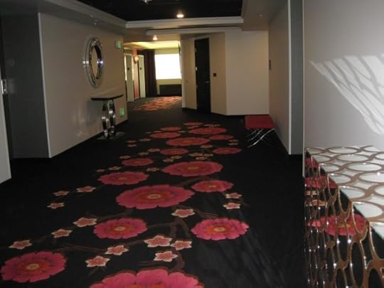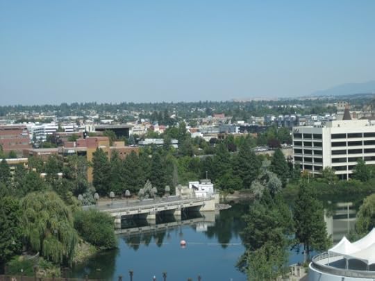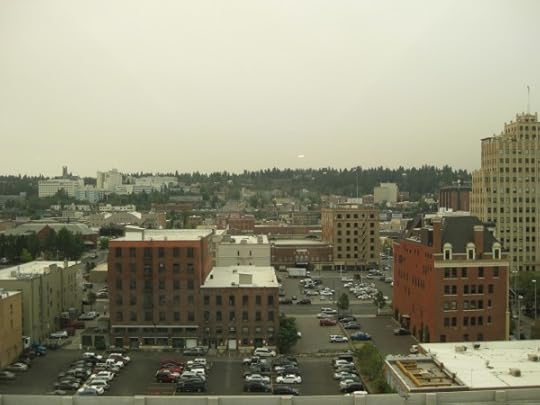I got to the con on Wednesday (drove to Houston on Tuesday, stayed overnight with friends, got up at 5:00 am to get to the airport, flew to Salt Lake City, then on to Spokane) and then Cassandra Clarke and I got a ride with a guy who was a taxi driver but did not have a taxi, and I checked into the lavish but impractical Davenport Grand. Then I went over and got registered at the con, then met up with a group and had dinner at a sushi place. As we were going there, we got our first real look at the smoke from the terrible forest fires in the state. It just filled the air and turned the sky brown, and the sun was a little red dot. (Some people attending the con ended up in the hospital with respiratory problems.)