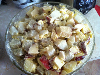 Puerto Rican Potato Salad made by yours truly. It contains potatoes, apples, eggs, and mayonnaise and that's all. (You mix the cooked egg yolk with the mayo.) Easy and so Yummy!