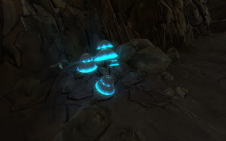 Some super cool lit mushrooms in a cave.