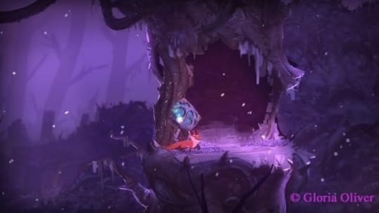 When you get the shard and try to go back, you find you can't get past a particular area. Something was said to you as a hint, and I was able to work it out. If you bark twice near the shard (it is an energy ball and floats - see the floating blue ball on the left?), the whole weather of the area changes to something else. So we went from spring to winter! So you change the weather to affect things. A rather ingenious idea for a puzzle game. (The weird thing on the right previously looked like an empty, dead flower pod. Now it will gather and throw out a giant snowball, allowing me to reach the tree limb on the left!)